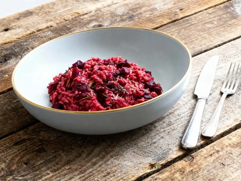 Bietenrisotto is een manier om verse bietjes in een gerecht te verwerken dat normaliter als licht gerecht gezien wordt.