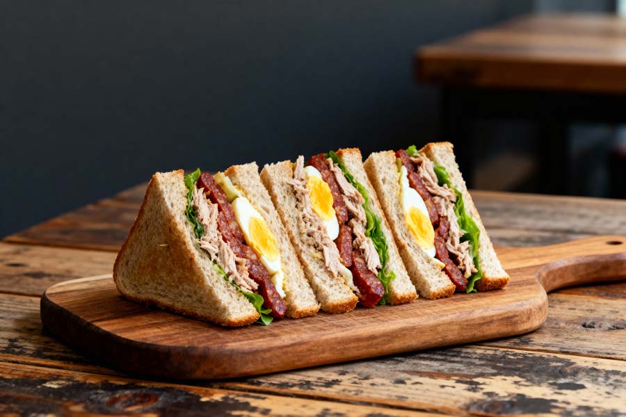 Clubsandwiches met tonijn, chorizo en ei