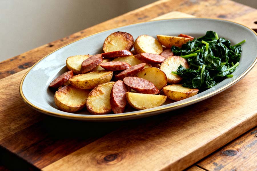 Gebakken aardappel met worst en spinazie schotel