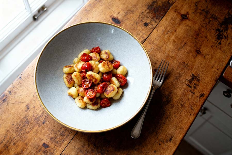 Gebakken gnocchie met tomaatjes, rucola en Parmezaanse kaas