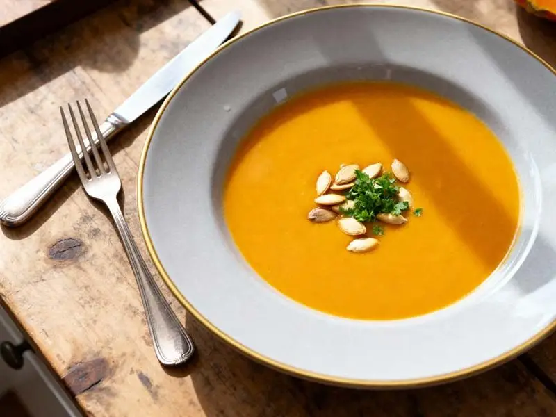 Als de soep eenmaal in de kom ligt, maak ik het af met een garnering die het geheel net dat beetje extra geeft. Geroosterde pompoenpitten voor een knapperige toets, een scheutje pompoenpitolie voor een aardse smaak, en misschien wat verse kruiden zoals koriander of peterselie. Dan neem ik mijn lepel, en met de eerste hap voel ik de warmte door me heen stromen, een culinair eerbetoon aan de eenvoud en rijkdom van de herfst.
