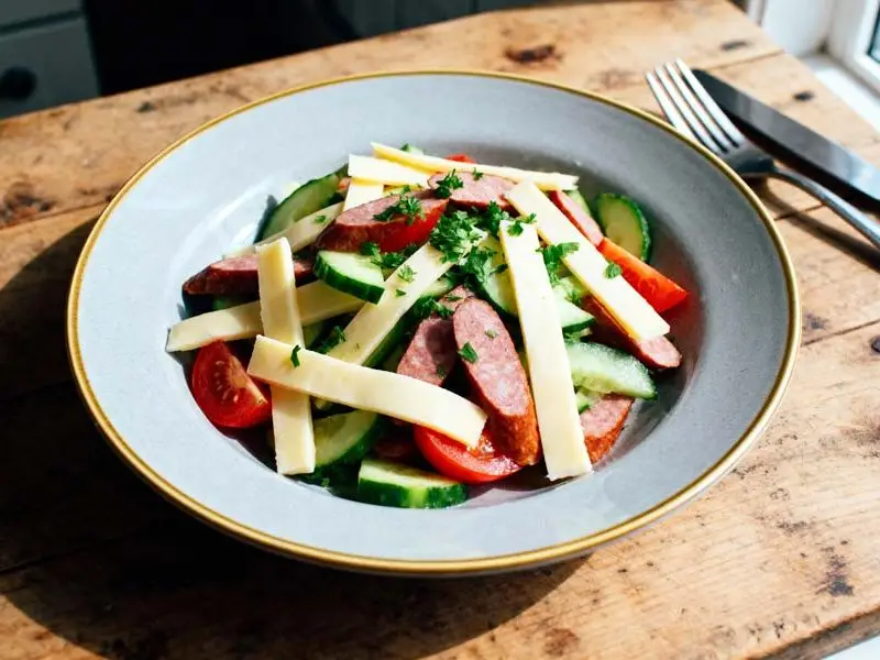 Met simpele ingrediënten zoals restjes harde kaas, een paar sneetjes rookworst of droge worst en een basis van frisse groenten zoals kropsla, komkommer en tomaat kun je een voedzame salade maken die licht op de portemonnee drukt. Door gebruik te maken van producten die vaak al in de voorraadkast of koelkast liggen, zoals een scheutje azijn of citroensap voor een snelle vinaigrette, blijft dit gerecht budgetvriendelijk. Het snijwerk is eenvoudig, en met wat aandacht voor de textuur, dunne plakjes worst, grof geraspte kaas, creëer je in een handomdraai een harmonieus geheel. Deze aanpak minimaliseert verspilling en maakt het ideaal voor koks die slim willen omgaan met hun ingrediënten en kosten.